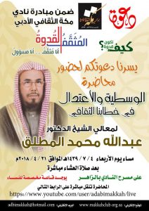 الوسطية والاعتدال في خطابنا الثقافي محاضرة لمعالي الشيخ عبدالله المطلق مساء الاربعاء 4/7/1439